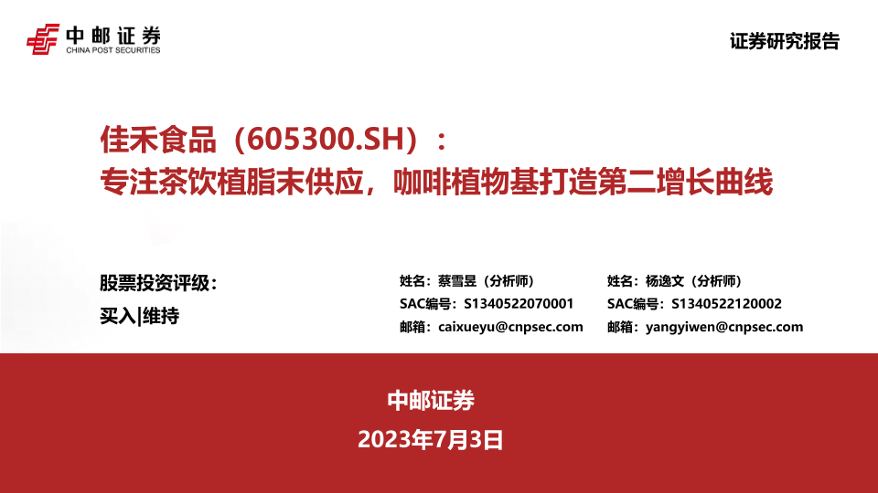 【中邮证券】【20230703】佳禾食品(605300.SH):专注茶饮植脂末供应,咖啡植物基打造第二增长曲线-40页
