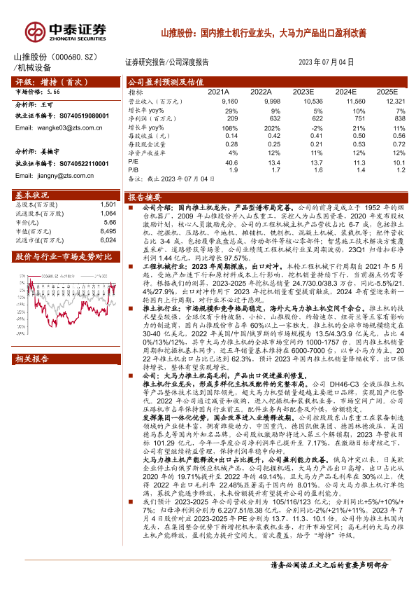 【中泰证券】【20230704】山推股份:国内推土机行业龙头,大马力产品出口盈利改善-22页
