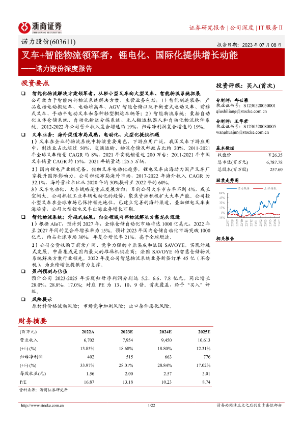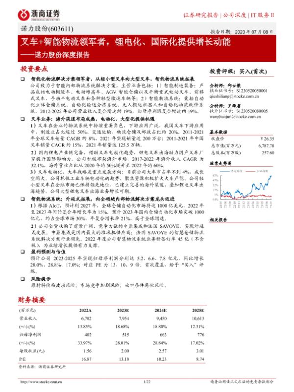 【浙商证券】【20230708】诺力股份深度报告:叉车+智能物流领军者,锂电化、国际化提供增长动能-22页