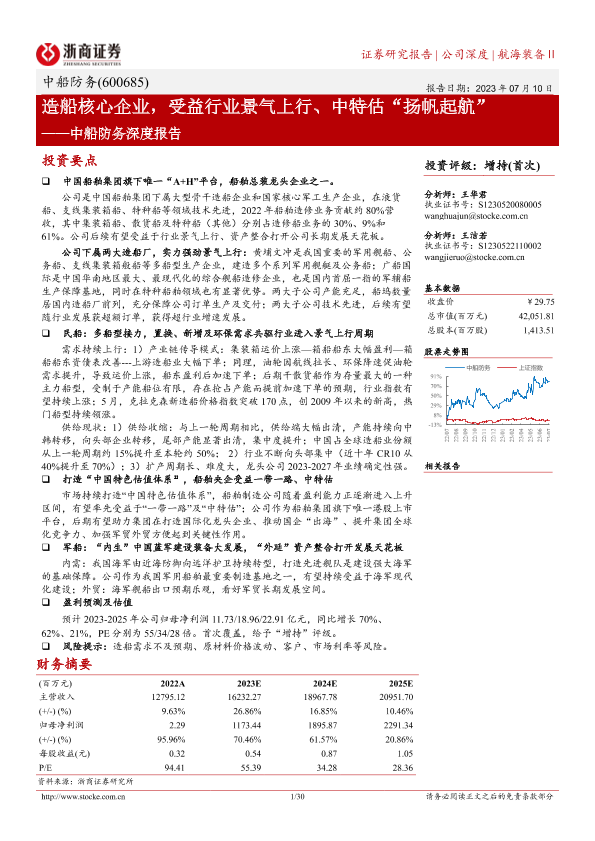 【浙商证券】【20230710】中船防务深度报告:造船核心企业,受益行业景气上行、中特估“扬帆起航”-30页