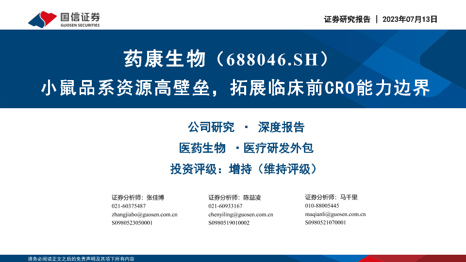 【国信证券】【20230713】药康生物-小鼠品系资源高壁垒,拓展临床前CRO能力边界-46页