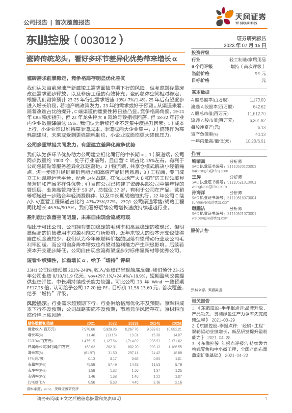 【天风证券】【20230715】东鹏控股-瓷砖传统龙头,看好多环节差异化优势带来增长α-13页