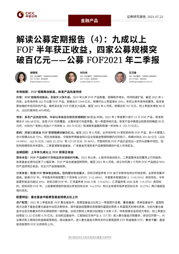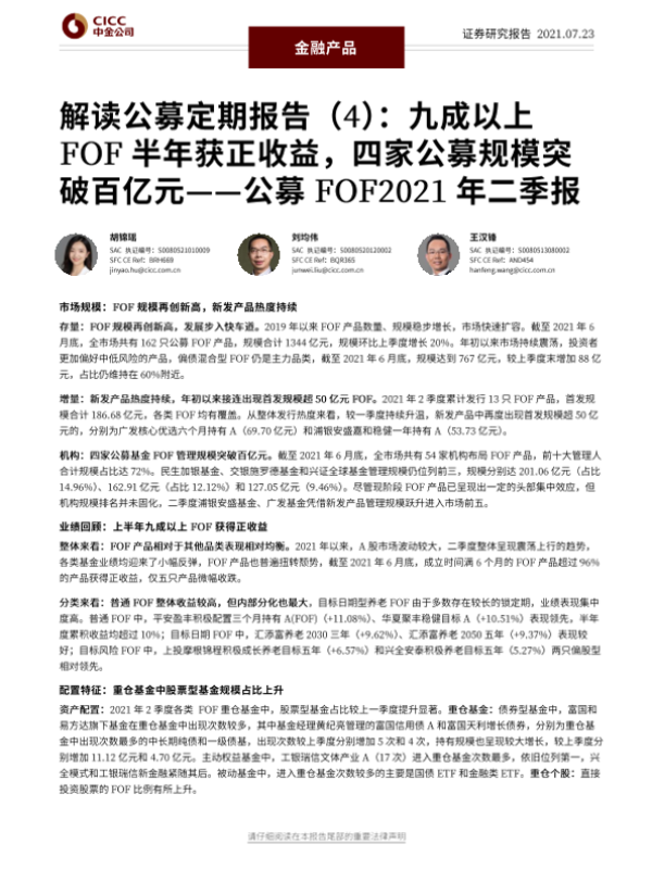 【中金公司】【20210723】公募FOF2021年二季报:解读公募定期报告(4),九成以上FOF半年获正收益,四家公募规模突破百亿元-12页