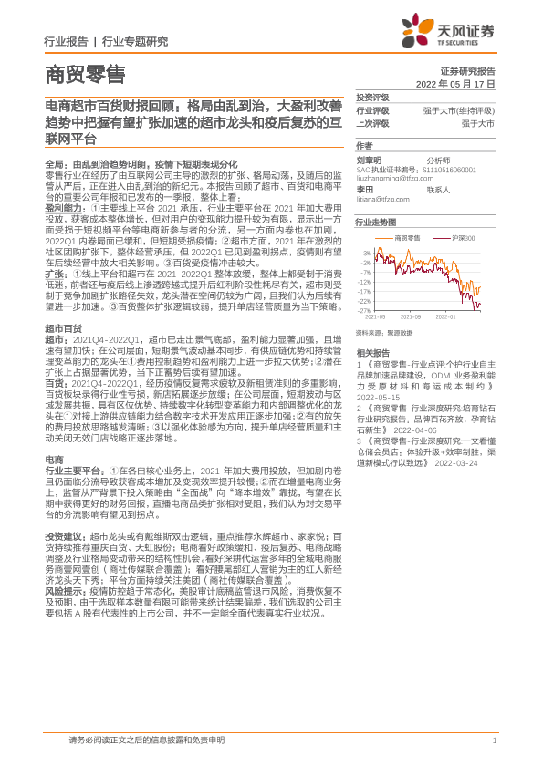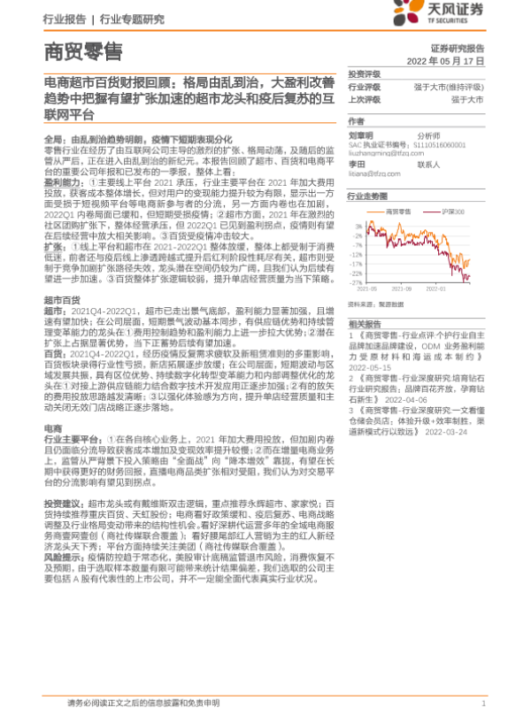 【天风证券】【20220517】商贸零售行业电商超市百货财报回顾:格局由乱到治,大盈利改善趋势中把握有望扩张加速的超市龙头和疫后复苏的互联网平台-16页