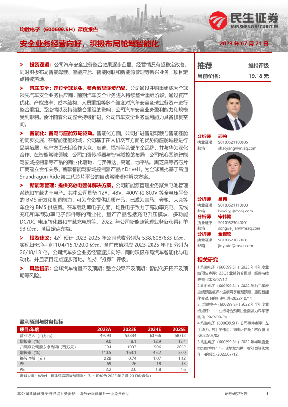 【民生证券】【20230721】20230721-民生证券-均胜电子-600699.SH-深度报告:安全业务经营向好,积极布局舱驾智能化-27页