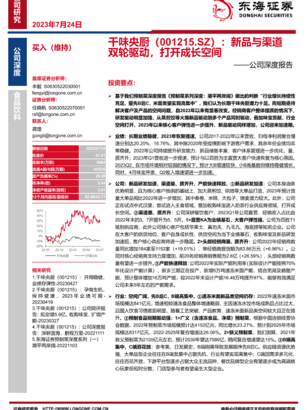 【东海证券】【20230724】千味央厨(001215.SZ):新品与渠道双轮驱动,打开成长空间——公司深度报告-61页