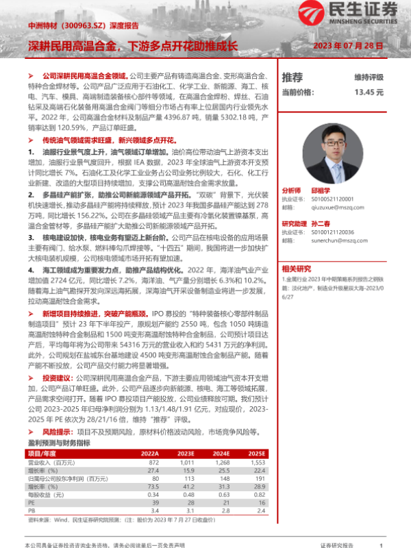 【民生证券】【20230728】20230728-民生证券-中洲特材-300963.SZ-深度报告:深耕民用高温合金,下游多点开花助推成长-33页