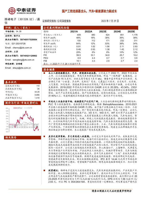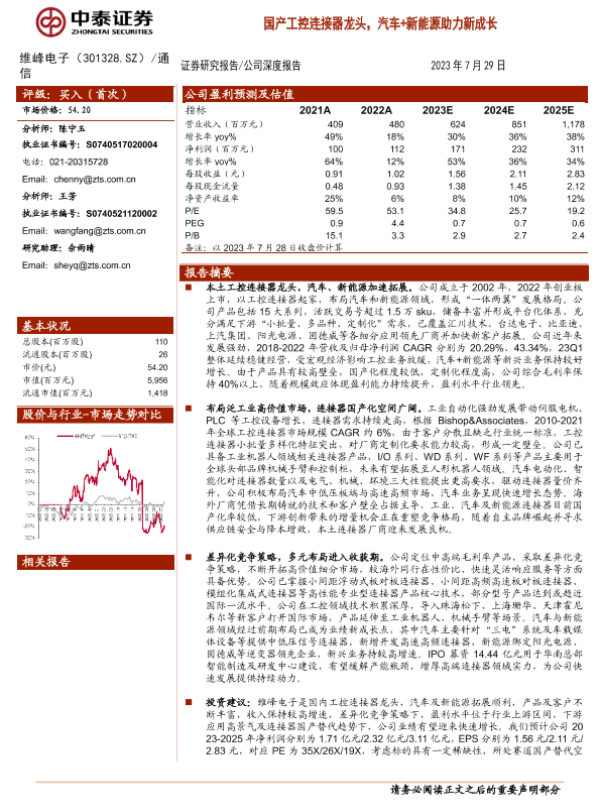 【中泰证券】【20230729】20230729-中泰证券-维峰电子-301328.SZ-国产工控连接器龙头,汽车+新能源助力新成长-44页