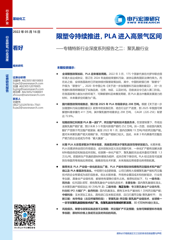 【申万宏源】【20220516】基础化工行业专精特新行业深度系列报告之二:聚乳酸行业,限塑令持续推进,PLA进入高景气区间-43页