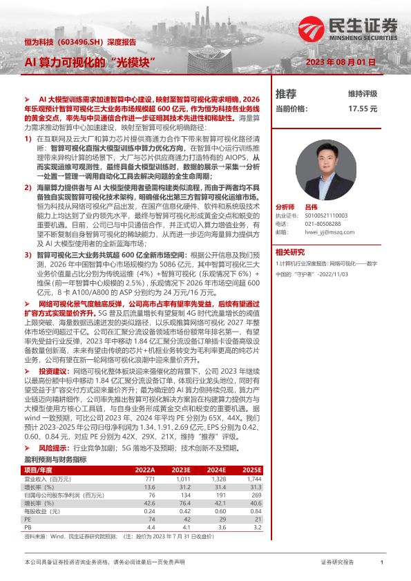 【民生证券】【20230801】20230801-民生证券-恒为科技-603496.SH-深度报告:AI算力可视化的“光模块”-39页