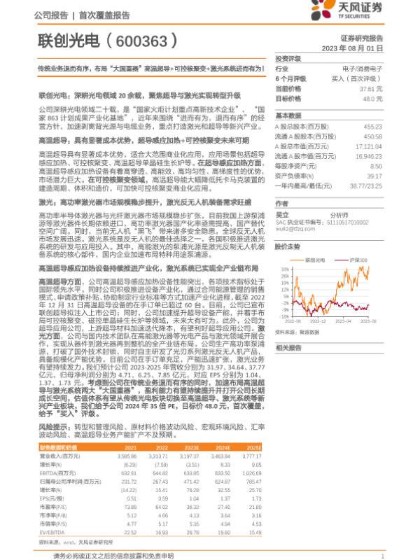 【天风证券】【20230801】联创光电-600363.SH-传统业务退而有序,布局“大国重器”高温超导+可控核聚变+激光系统进而有为!-32页