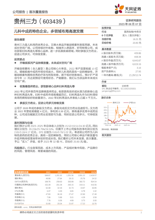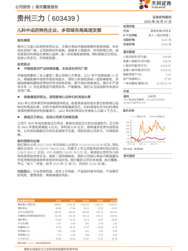 【天风证券】【20230807】20230807-天风证券-贵州三力-603439.SH-儿科中成药特色企业,多领域布局高速发展-21页