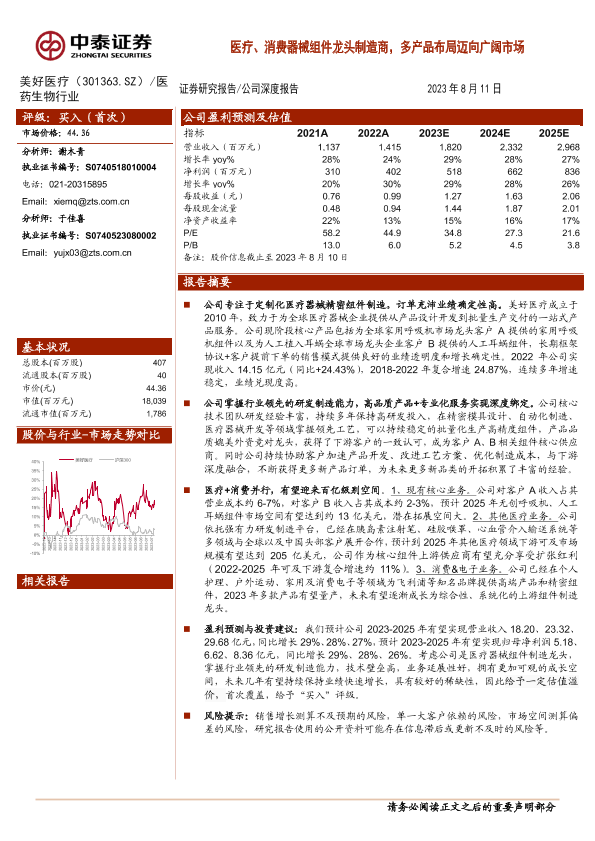 【中泰证券】【20230811】中泰证券-美好医疗-301363.SZ-医疗、消费器械组件龙头制造商,多产品布局迈向广阔市场-21页