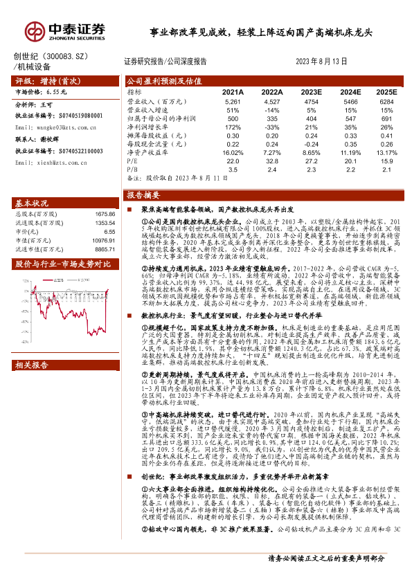 【中泰证券】【20230813】中泰证券-创世纪-300083.SZ-事业部改革见成效,轻装上阵迈向国产高端机床龙头-29页