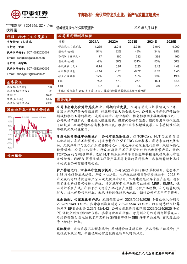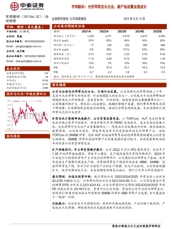 【中泰证券】【20230814】宇邦新材:光伏焊带龙头企业,新产品放量加速成长-17页