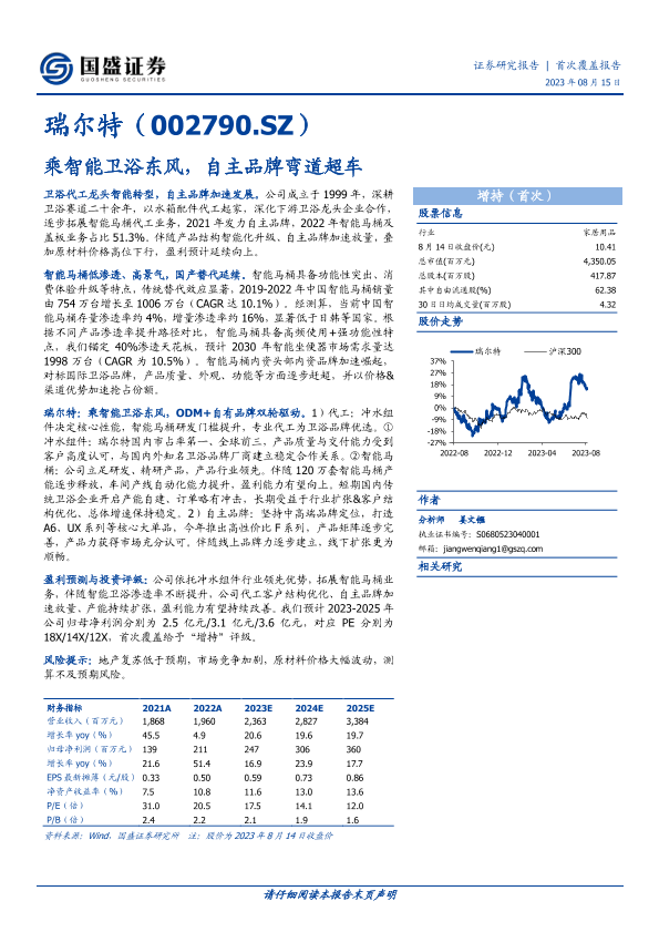 智能卫浴 瑞尔特 盈利预测 自主品牌 行业分析