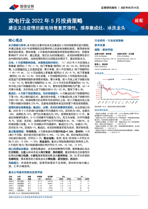 【国信证券】【20220514】家电行业2022年5月投资策略:建议关注疫情后家电销售复苏弹性,推荐集成灶、冰洗龙头-19页