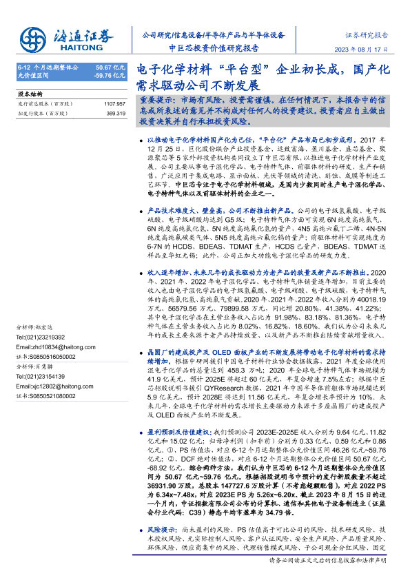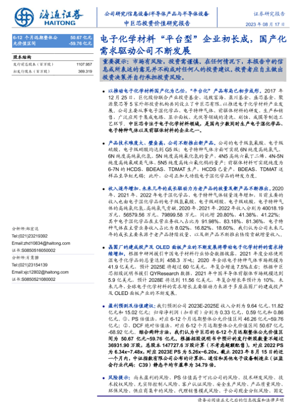 【海通证券】【20230817】中巨芯-688549.SH-电子化学材料“平台型”企业初长成,国产化需求驱动公司不断发展-53页