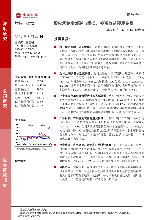 【东莞证券】【20230821】20230821-东莞证券-华泰证券-601688.SH-深度报告:股权承销金额逆市增长,投资收益预期高增-27页
