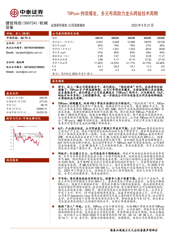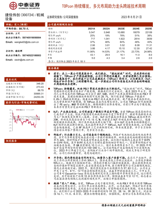 【中泰证券】【20230821】20230821-中泰证券-捷佳伟创-300724.SZ-TOPcon持续爆发,多元布局助力龙头跨越技术周期-28页