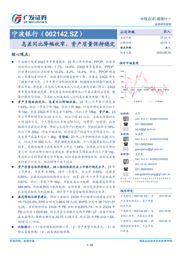 【广发证券】【20230824】宁波银行(002142.SZ) 息差同比降幅收窄,资产质量保持稳定-23页