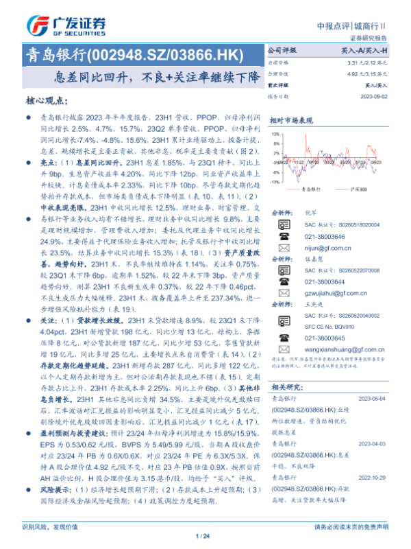 【广发证券】【20230902】20230902-广发证券-青岛银行-002948.SZ-息差同比回升,不良+关注率继续下降-24页