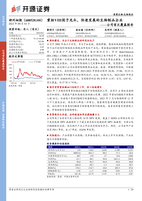 【开源证券】【20230903】20230903-开源证券-神州细胞-688520.SH-公司首次覆盖报告:重组Ⅷ因子龙头,快速发展的生物制品企业-29页