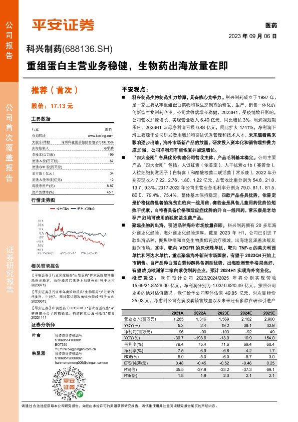 【平安证券】【20230906】20230906-平安证券-科兴制药-688136.SH-首次覆盖报告:重组蛋白主营业务稳健,生物药出海放量在即-22页