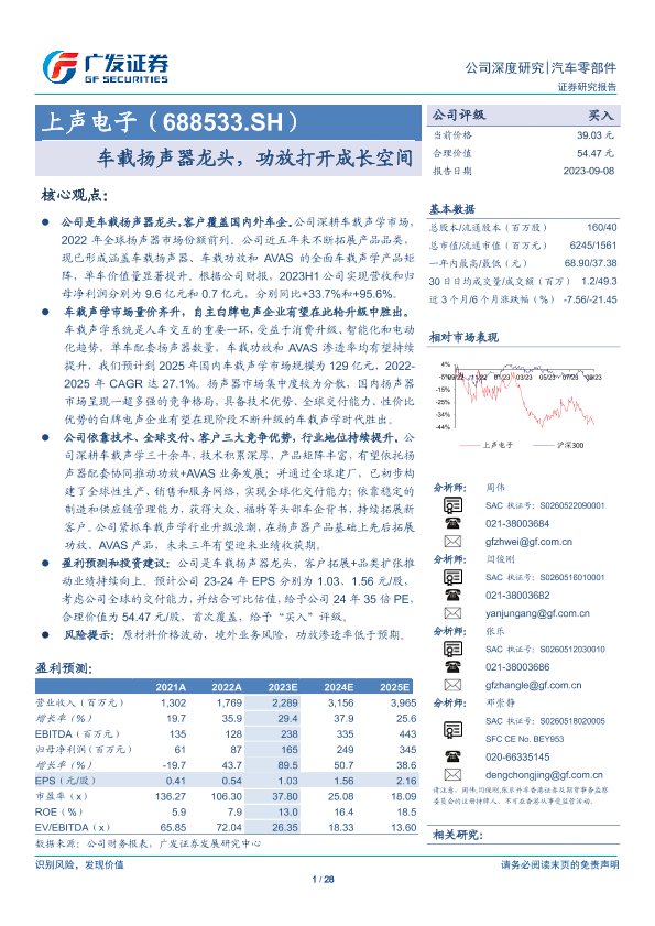 【广发证券】【20230908】上声电子(688533.SH):车载扬声器龙头,功放打开成长空间-28页