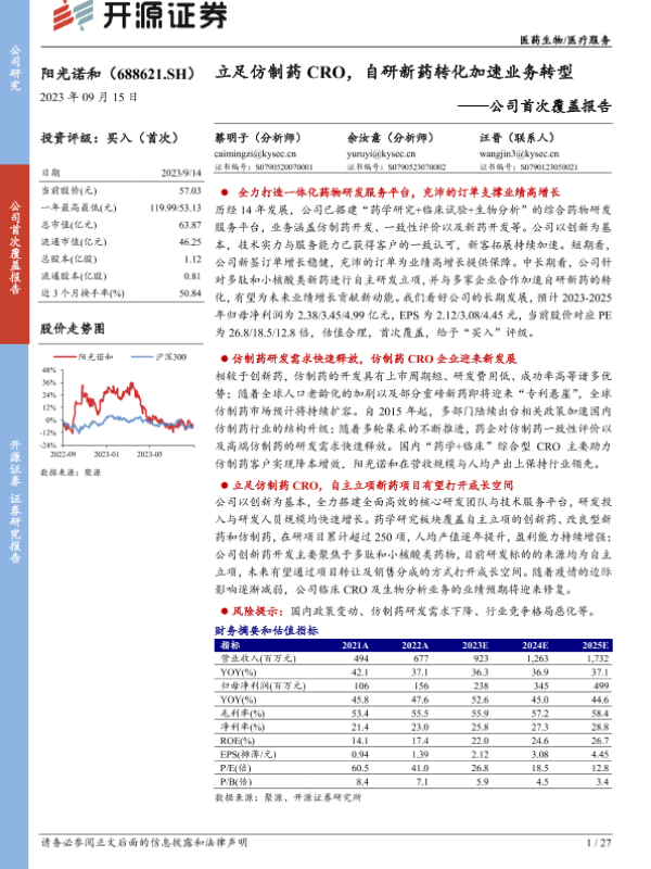 【开源证券】【20230915】阳光诺和-688621.SH-公司首次覆盖报告:立足仿制药CRO,自研新药转化加速业务转型-27页
