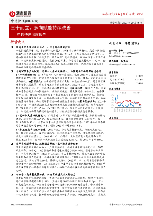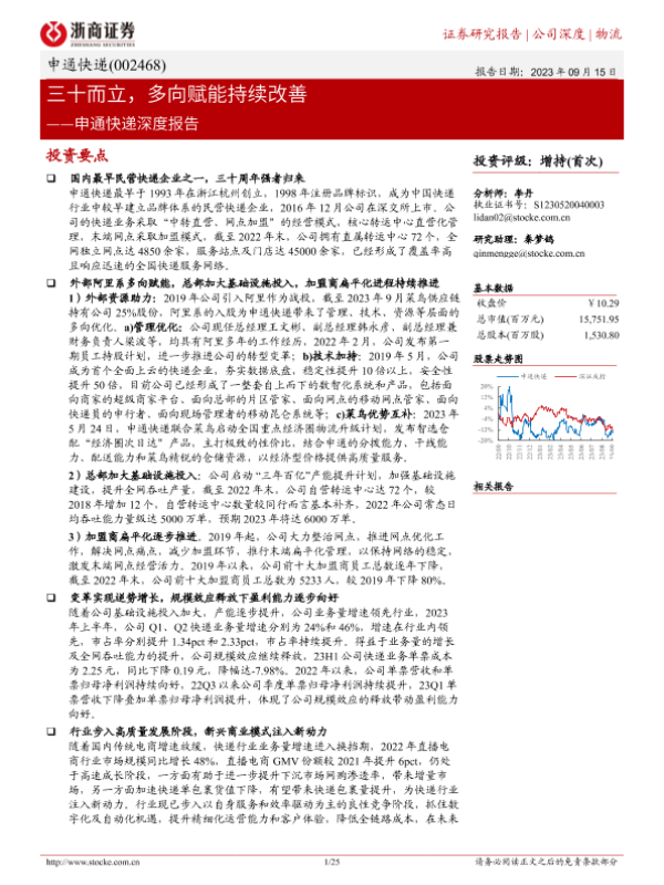 【浙商证券】【20230915】申通快递深度报告:三十而立,多向赋能持续改善-25页