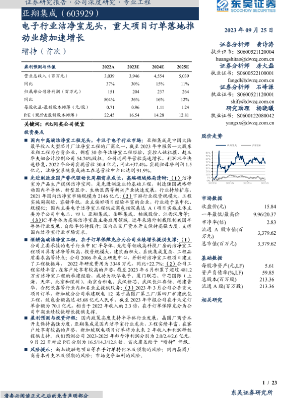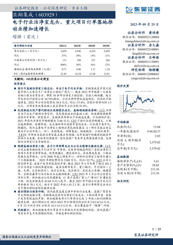 【东吴证券】【20230925】亚翔集成-电子行业洁净室龙头,重大项目订单落地推动业绩加速增长-23页