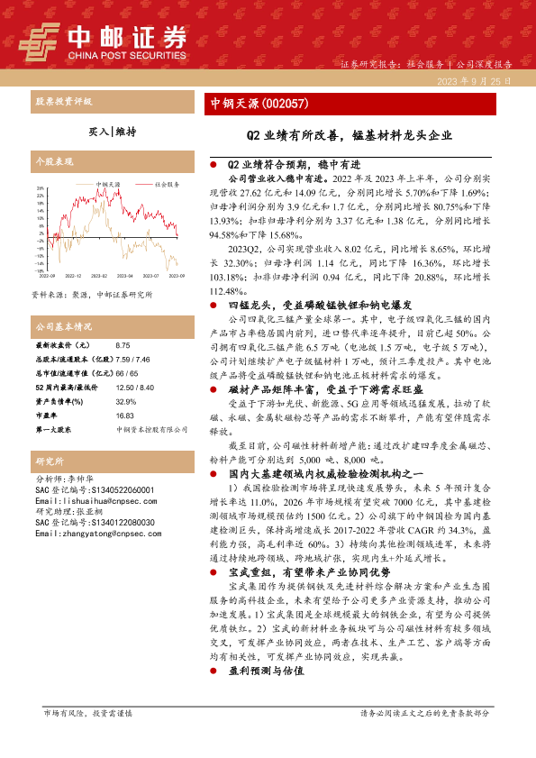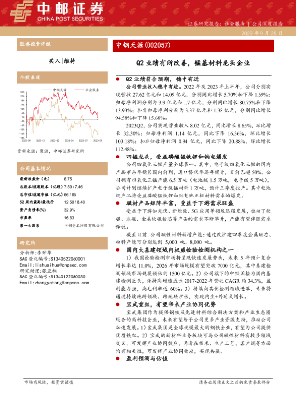 【中邮证券】【20230925】中钢天源(002057)Q2业绩有所改善,锰基材料龙头企业-26页