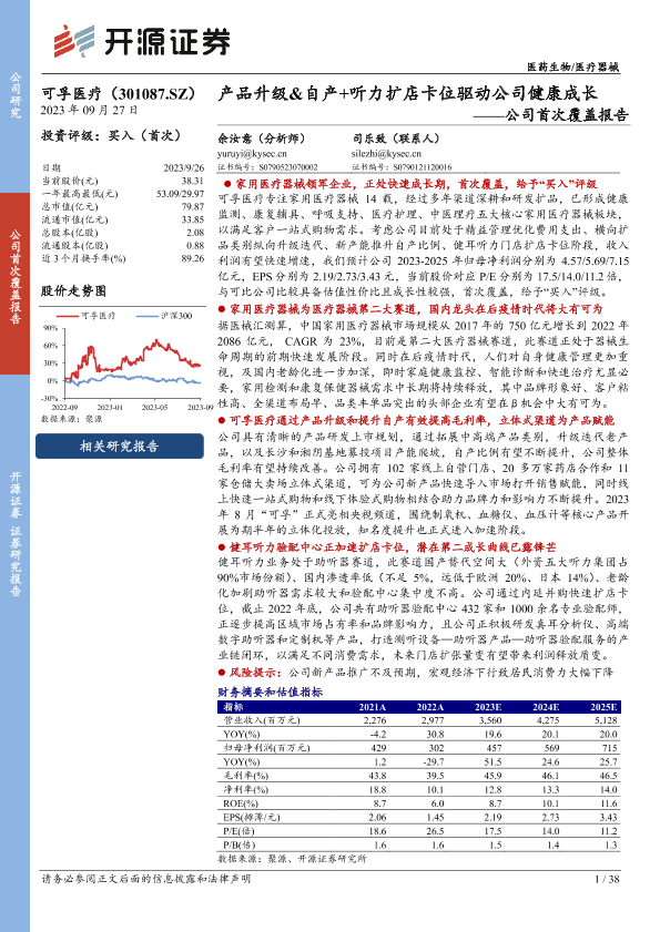 【开源证券】【20230927】20230927-开源证券-可孚医疗-301087.SZ-公司首次覆盖报告:产品升级&自产+听力扩店卡位驱动公司健康成长-38页