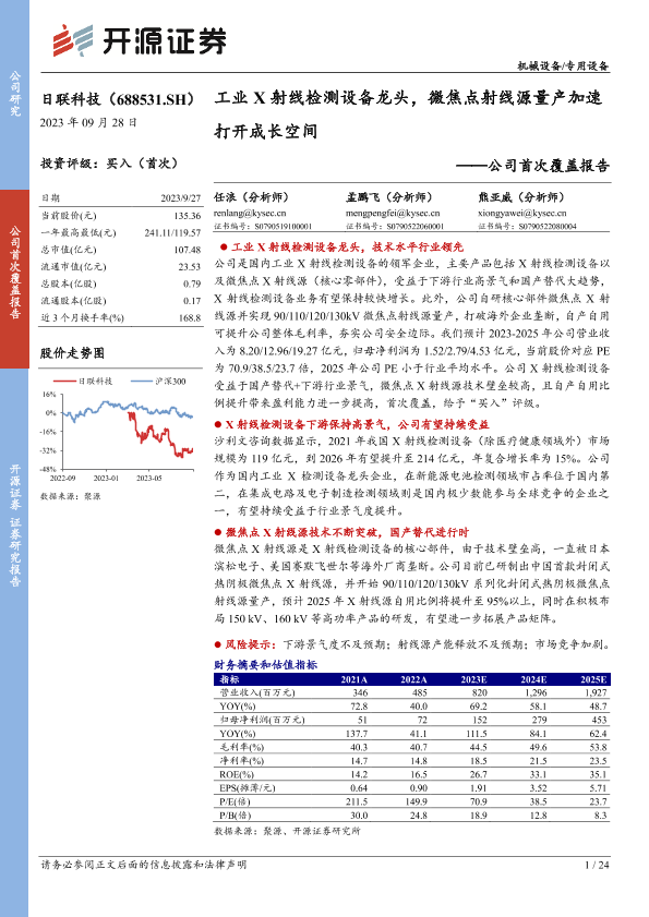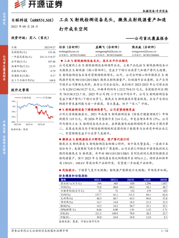 【开源证券】【20230928】20230928-开源证券-日联科技-688531.SH-公司首次覆盖报告:工业X射线检测设备龙头,微焦点射线源量产加速打开成长空间-24页