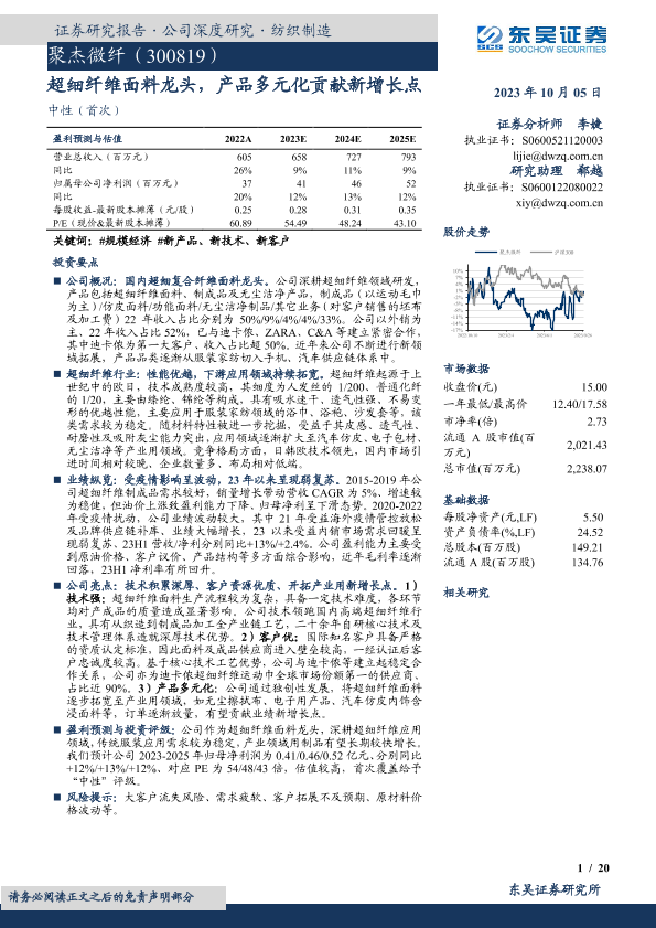 【东吴证券】【20231005】聚杰微纤-300819.SZ-超细纤维面料龙头,产品多元化贡献新增长点-20页