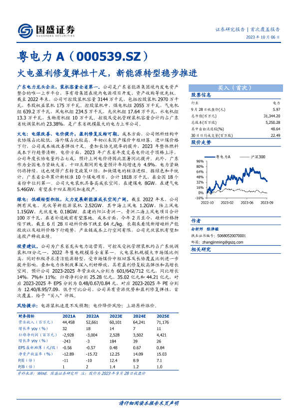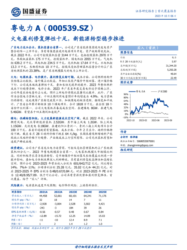 【国盛证券】【20231006】粤电力A(000539.SZ)火电盈利修复弹性十足,新能源转型稳步推进-20页