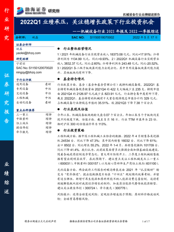 【渤海证券】【20220517】机械设备行业2021年报及2022一季报综述:2022Q1业绩承压,关注稳增长政策下行业投资机会-17页