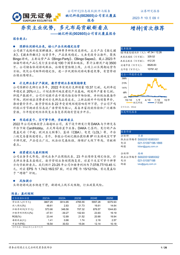 【国元证券】【20231009】姚记科技(002605)公司首次覆盖报告:夯实主业优势,多元布局贡献新看点-26页