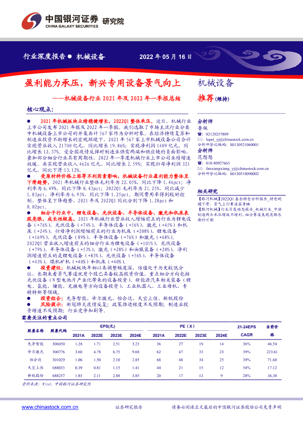 【银河证券】【20220516】机械设备行业2021年报及2022年一季报总结:盈利能力承压,新兴专用设备景气向上-87页