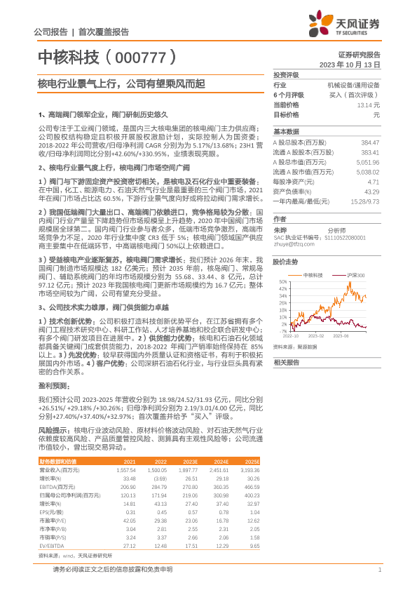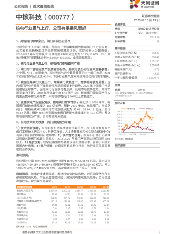 中核科技 机械设备 核电行业 股票分析 阀门市场