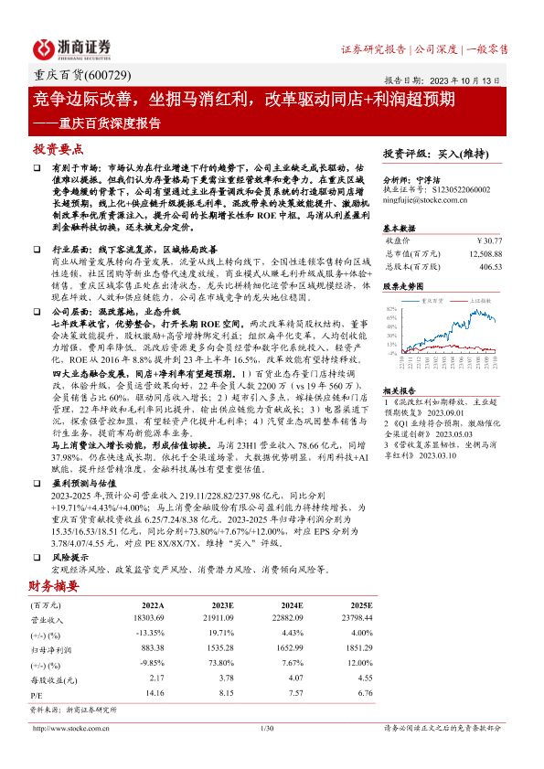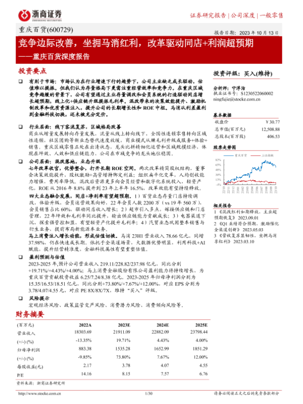【浙商证券】【20231013】重庆百货深度报告:竞争边际改善,坐拥马消红利,改革驱动同店+利润超预期-30页