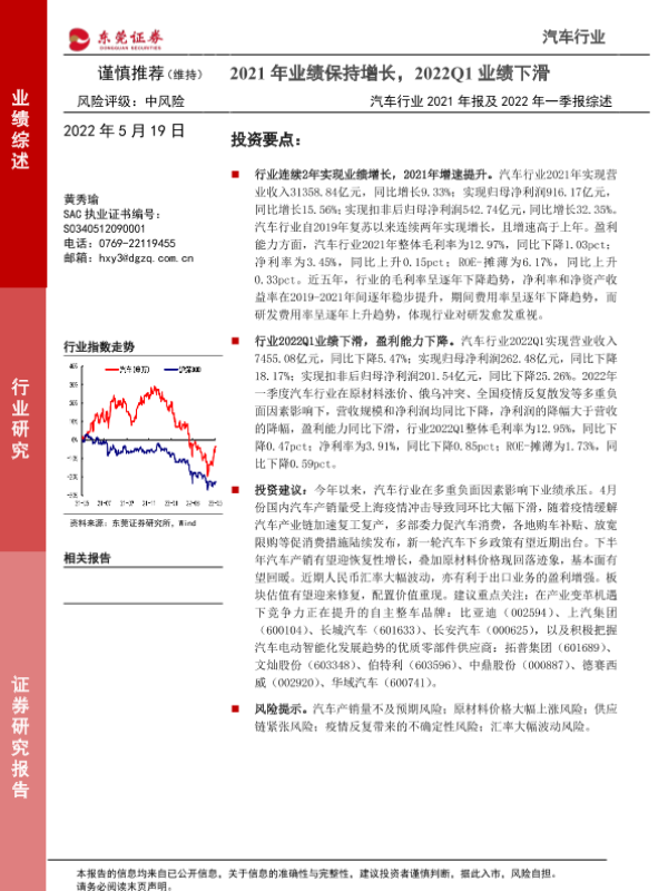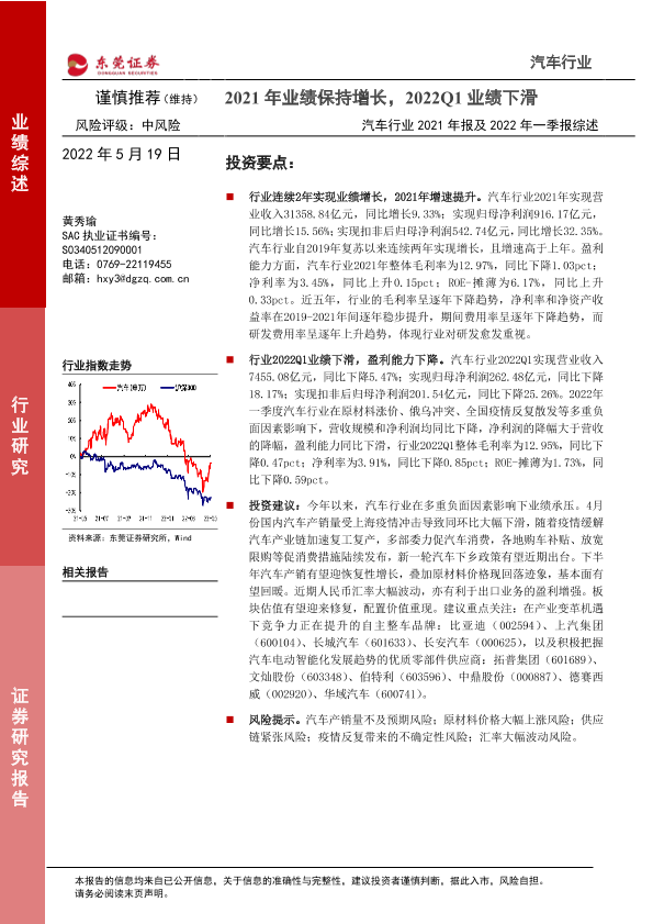【东莞证券】【20220519】汽车行业2021年报及2022年一季报综述:2021年业绩保持增长,2022Q1业绩下滑-25页
