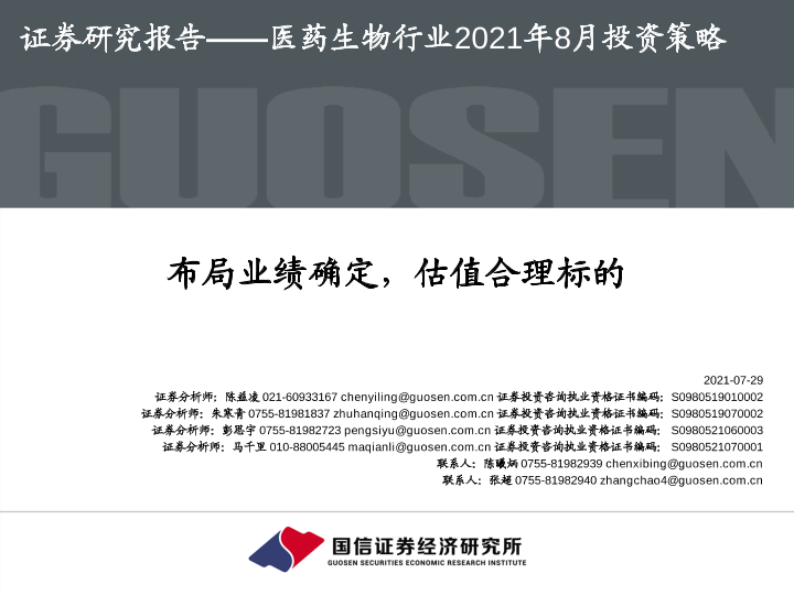【国信证券】【20210729】医药生物行业2021年8月投资策略:布局业绩确定,估值合理标的-42页