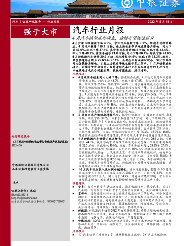 【中银证券】【20220518】汽车行业月报:4月汽车销量底部确立,后续有望快速提升-16页