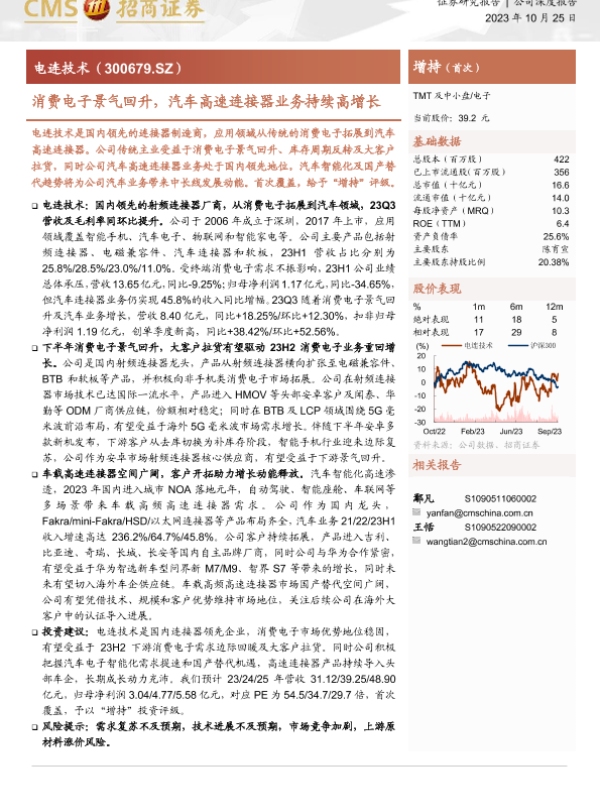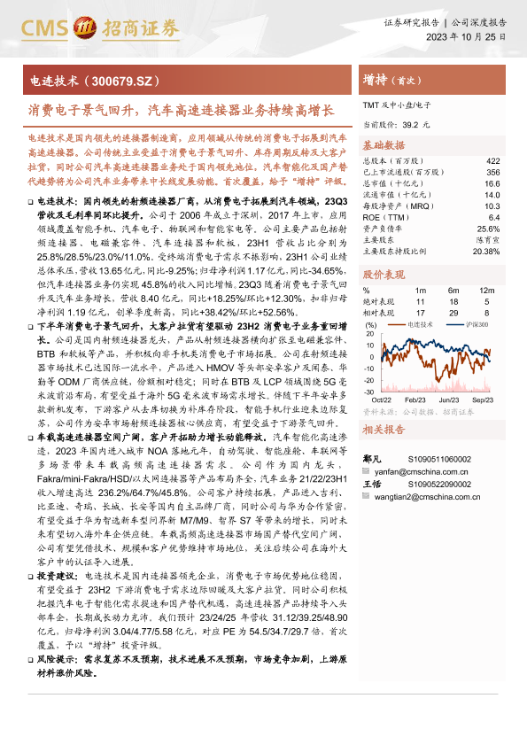 【海通证券】【20231025】20231025-招商证券-电连技术-300679.SZ-消费电子景气回升,汽车高速连接器业务持续高增长-20页