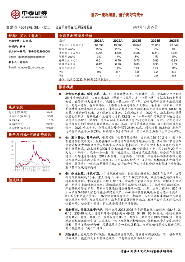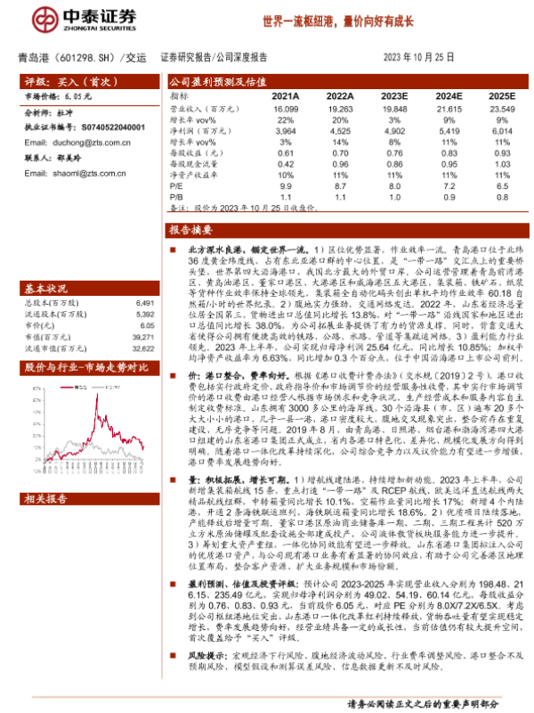 【中泰证券】【20231025】20231025-中泰证券-青岛港-601298.SH-世界一流枢纽港,量价向好有成长-29页
