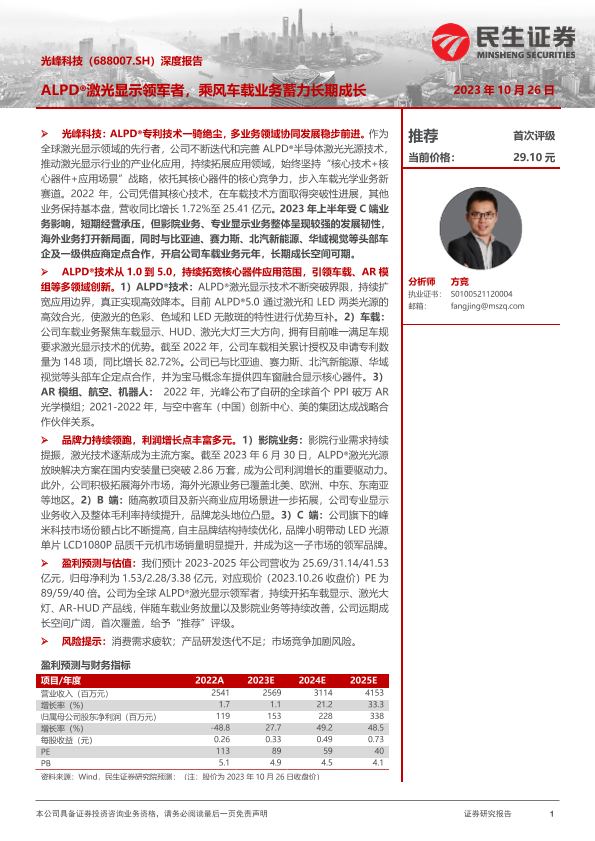 【民生证券】【20231026】20231026-民生证券-光峰科技-688007.SH-深度报告:ALPD®激光显示领军者,乘风车载业务蓄力长期成长-34页