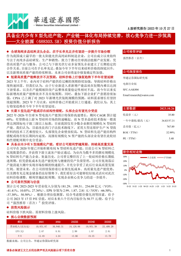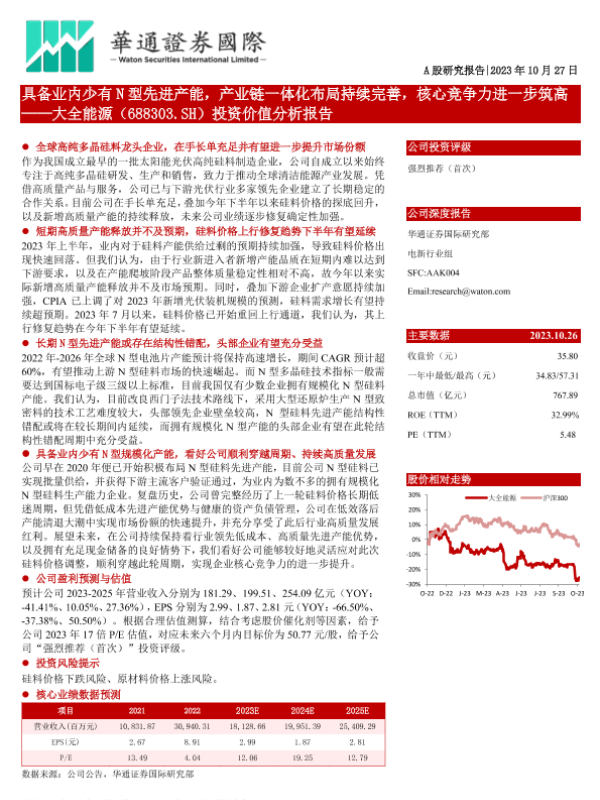 【华通证券国际】【20231027】具备业内少有N型先进产能,产业链一体化布局持续完善,核心竞争力进一步筑高——大全能源(688303.SH)投资价值分析报告-28页