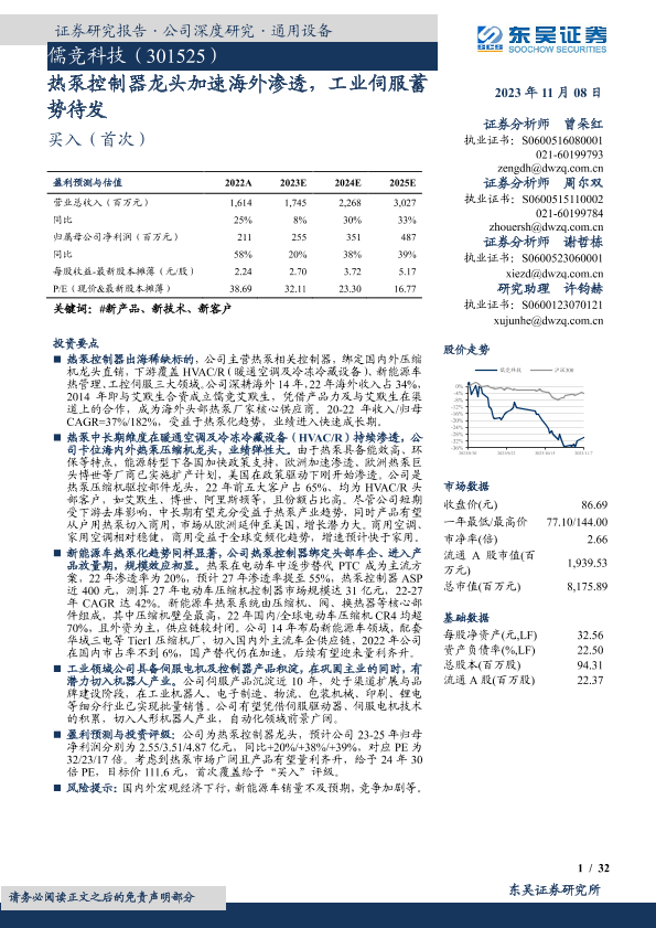 【东吴证券】【20231108】儒竞科技-301525.SZ-热泵控制器龙头加速海外渗透,工业伺服蓄势待发-32页